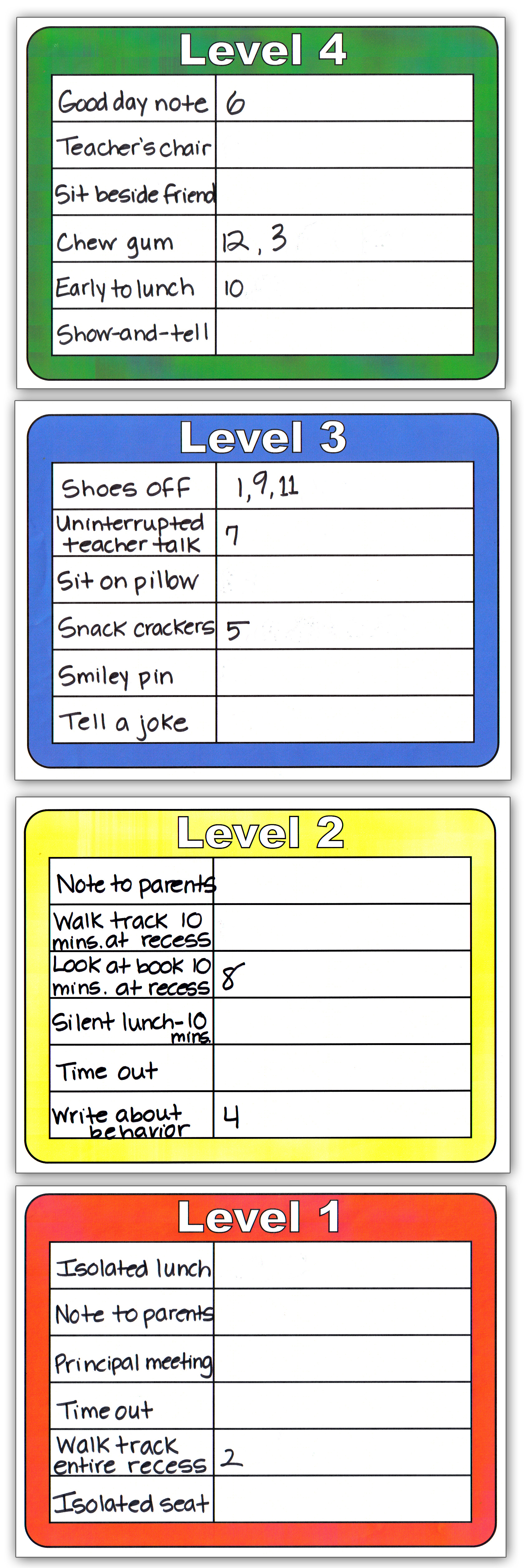 - Choose level 1, 2, 3 and 4 rewards/consequences and write them on the left side of the posters using a black overhead marker.