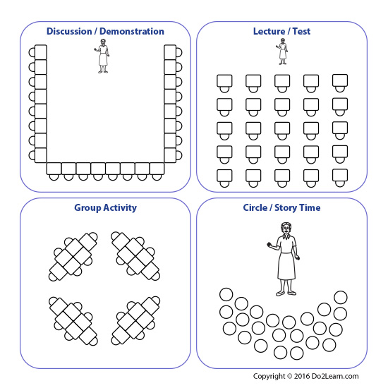 The way in which the desks are to be arranged in your room is determined based on the task you wish the students to accomplish. When teaching procedures on the first day of school, desks should be arranged so that all students’ eyes are focused on you as you explain procedures and rules. When students are collaborating, their desks should be pushed together in groups.