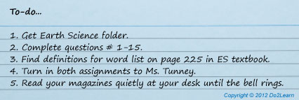 The ‘to do list’ (also referred to as a ‘work system’) prevents confusion and provides predictability to the student about the sequence and amount of activities he will do in that space. Students need to know the sequence of activities, need to see progress within and between activities, need to understand when a task is finished and need to know what activity will follow the completion of those activities in the ‘to do list.’ The ‘to do list’ is an effective tool, when individually designed, in supporting a host of academic and vocational behaviors, including stamina, sustained on-task behavior, independence in movement within and between tasks, and potentially in reducing errors in performance.