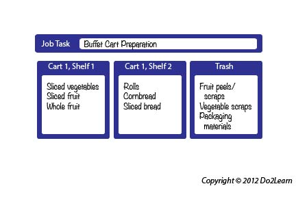 Another organizer may arrange information to clarify issues of a specific work environment. For example, the following could be used to support a student working in a food preparation department. Such a tool in the form of a blank template may be used by the worker as a tool to write-in details per task or shift: