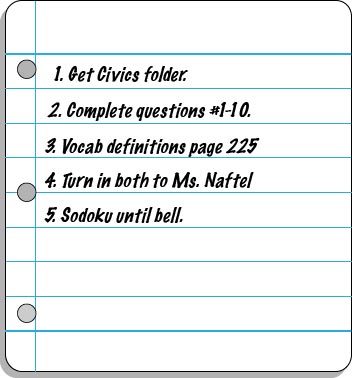 How will the student interact with his to-do list or instruction list to ensure that he is consistently using and referencing it? Will he check items off, delete items, place completed items in a folder, place items in a “finished” bin to represent completion of a task, etc.?