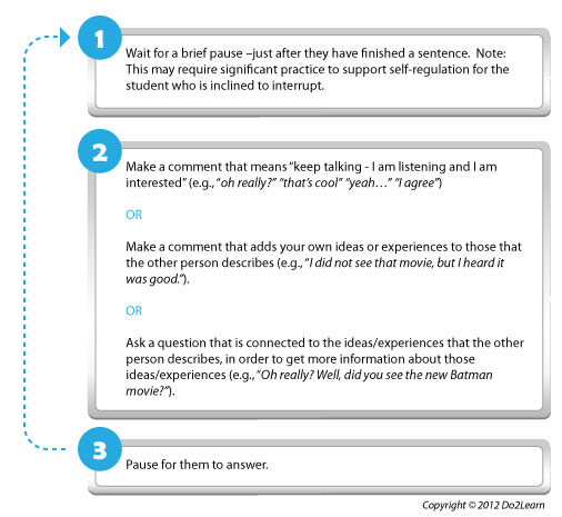 For some, this PAUSE to promote reciprocity is challenging. Some individuals might “monologue” about a topic that is of high interest to them, regardless of whether that topic is also of high interest to the person on the “receiving end” of this monologue. In such cases, it can be hard for the other person to fit even one word in, and even if they do, the individual might not even acknowledge that comment as he continues to talk. In this case, you will need to target strategies that support self-regulation within communication, while emphasizing how the failure to self-regulate (i.e., to monologue) is perceived by the person on the receiving end.