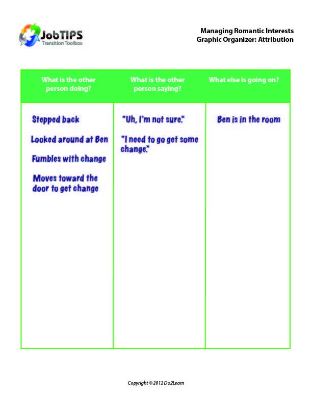 While making a request for social activity outside of work, the student may need practice in using a graphic organizer to help him attend to key details that support attribution. The organizer may be used in practice to help him think about the verbal and non-verbal behaviors of his conversation partner and to the environmental details that are relevant.