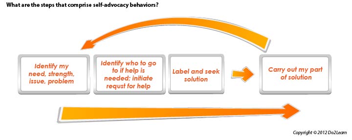 Advocating for oneself is a skill that is used throughout life and in all environments. A student may need to advocate for himself in school to ask for supports or accommodations, to defend his opinions and choices, explain his needs, and seek a solution. An employee may need to share satisfaction or frustrations with his job and advocate for changes. If an employee seeks accommodations in the workplace under the Americans with Disabilities Act, he will need to request those accommodations. Similarly, if a student seeks accommodations in a post-secondary setting, he will need to request those supports. Self-advocacy is also important in the student’s adult life as he makes choices and decisions about where he wants to live and who he wants to spend time with. Self-advocacy is one of the “building blocks” of self-determination.