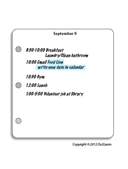 What information should be included on the schedule and the calendar? Carefully balance including enough details to support the student while restricting the amount of information to avoid confusion. For example, a weekly calendar may have only the name of an employer on the day and time to contact for follow-up. A separate reference in the student’s notebook may house the details of the employer’s name, contact information, etc. (see Visual Cues)