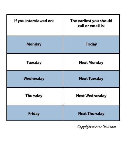 A job search schedule or calendar will be different from a daily schedule as this can document interviews, contact dates, possible answers or other information regarding the job search. For example: