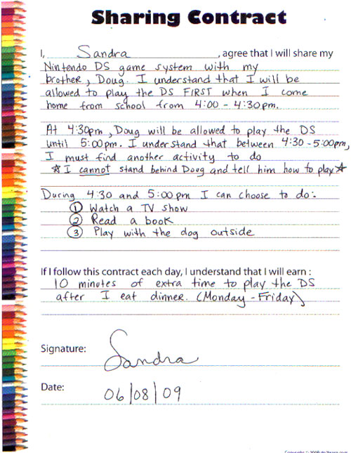 It is important to remember that individuals with social or behavioral issues find sharing things with others a real challenge. Some individuals may hoard things or have tantrums if they are required to share, even as adolescents or adults. The contingency based contract may help to provide information about the “sharing” and encourage them to participate more readily than without one. |
