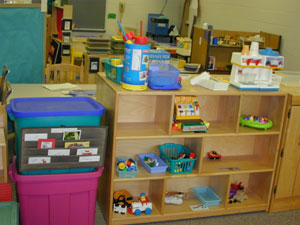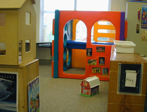 Play centerLarge and small motor skills are used playing in the playhouse and with the toys on the shelves. |