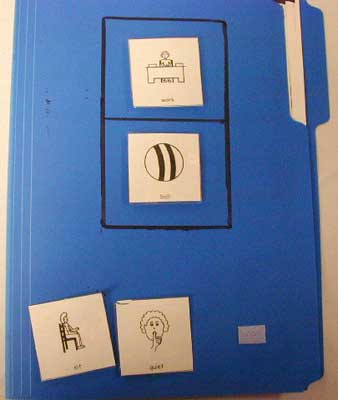 This is an example of a school work communication folder. All the information that is needed to get the task done is organized and listed here. Handy for homework and classroom work. Communication folders are wonderful for building independence.