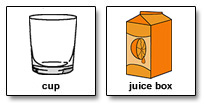 Display pictures of food and drink on the refrigerator. This can be done with magnets, tape, or a cardboard "choice board" with picture cards attached. When you know someone wants a drink, hand him the corresponding card (cup, juice box - be consistent). Have him look at the picture. Say "drink." Have him give you the drink card. Reinforce this repetitively several times before giving him the drink. It is easiest to teach these skills when someone is highly motivated, and that often involves food!
